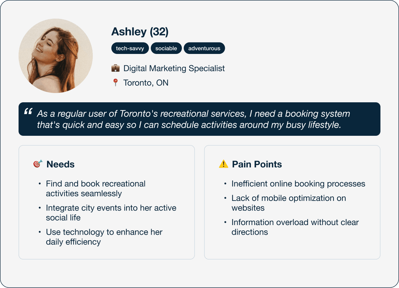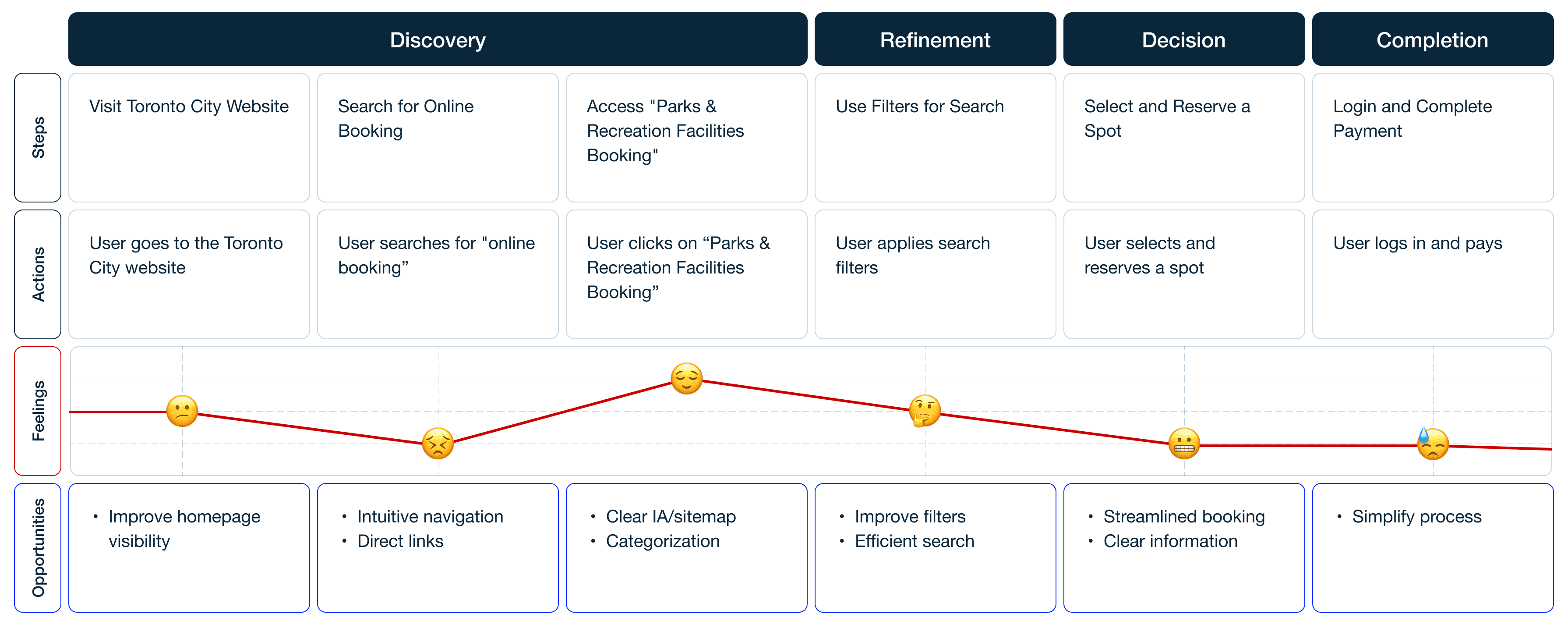 This user journey shows Ashely’s process of booking a picnic spot with fire pits on the Toronto City website. It allowed me to pinpoint opportunities for design improvements at crucial moments.
