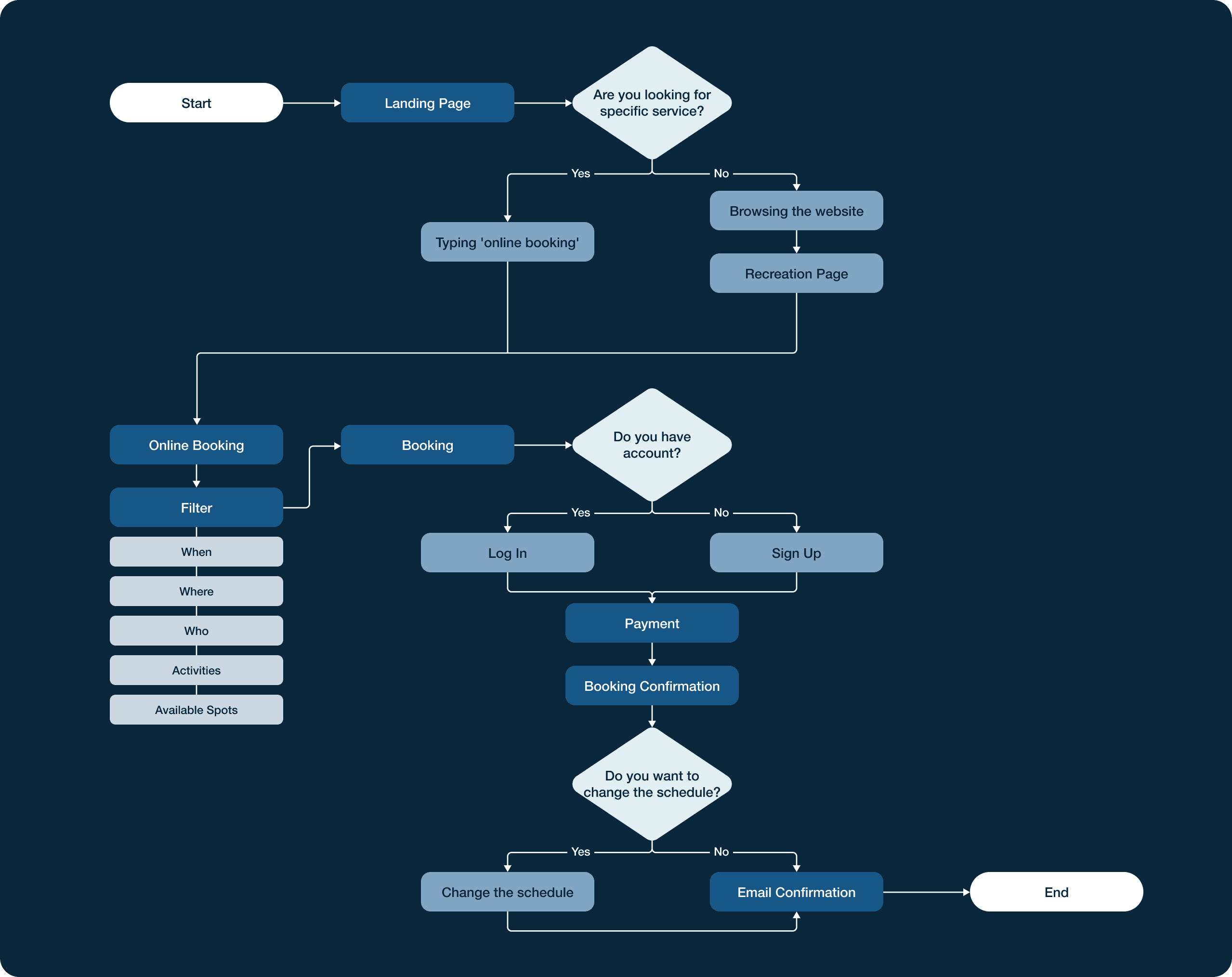 This user flow outlines the detailed steps a user needs to take in order to find and book an activity, which is the core task of this project. It enables me to integrate the features together and also provides a guide for the information architecture.