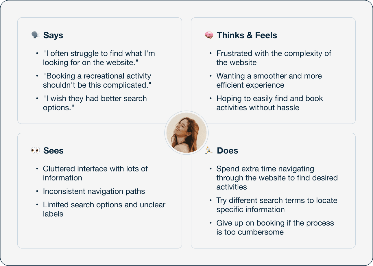 I developed an empathy map from the persona to better understand user needs, aiming to use these insights for designing a more user-focused online booking service.